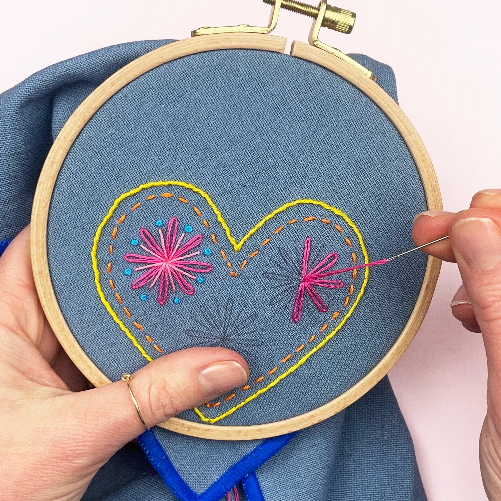 To get started, you’ll need a few embroidery basics: fabric (cotton and other smooth natural fabrics work best), embroidery thread, a needle, small scissors and ideally an embroidery hoop to keep your fabric taut while you stitch. You can find all the hoops, threads, needles and tools you need here.