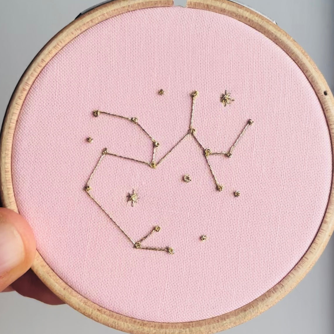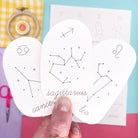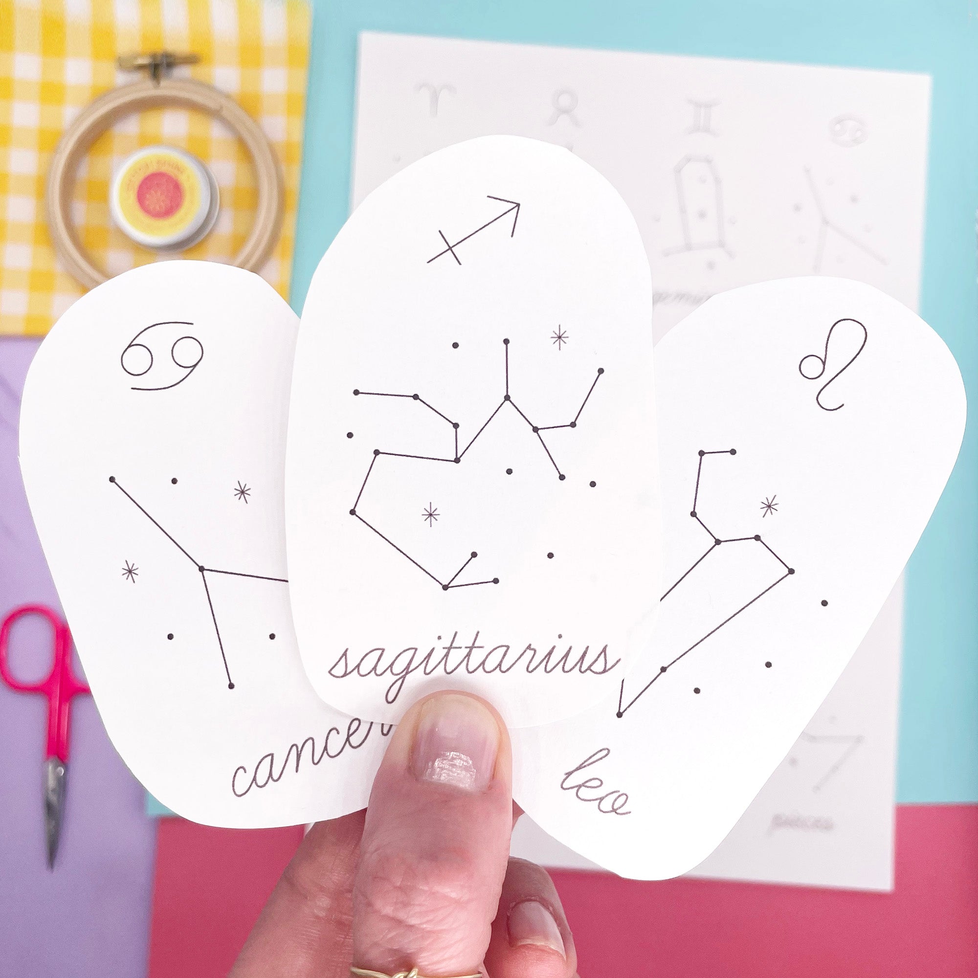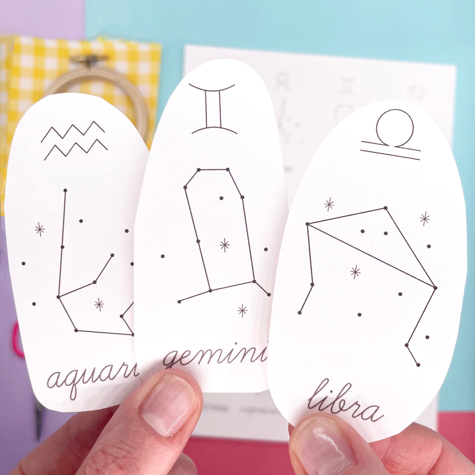 - 1 A4 (21cm x 29cm or 8" x 11.5") sheet iron-on zodiac embroidery patterns featuring 12 designs of zodiac star maps, symbols and text