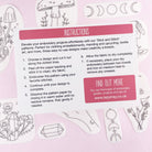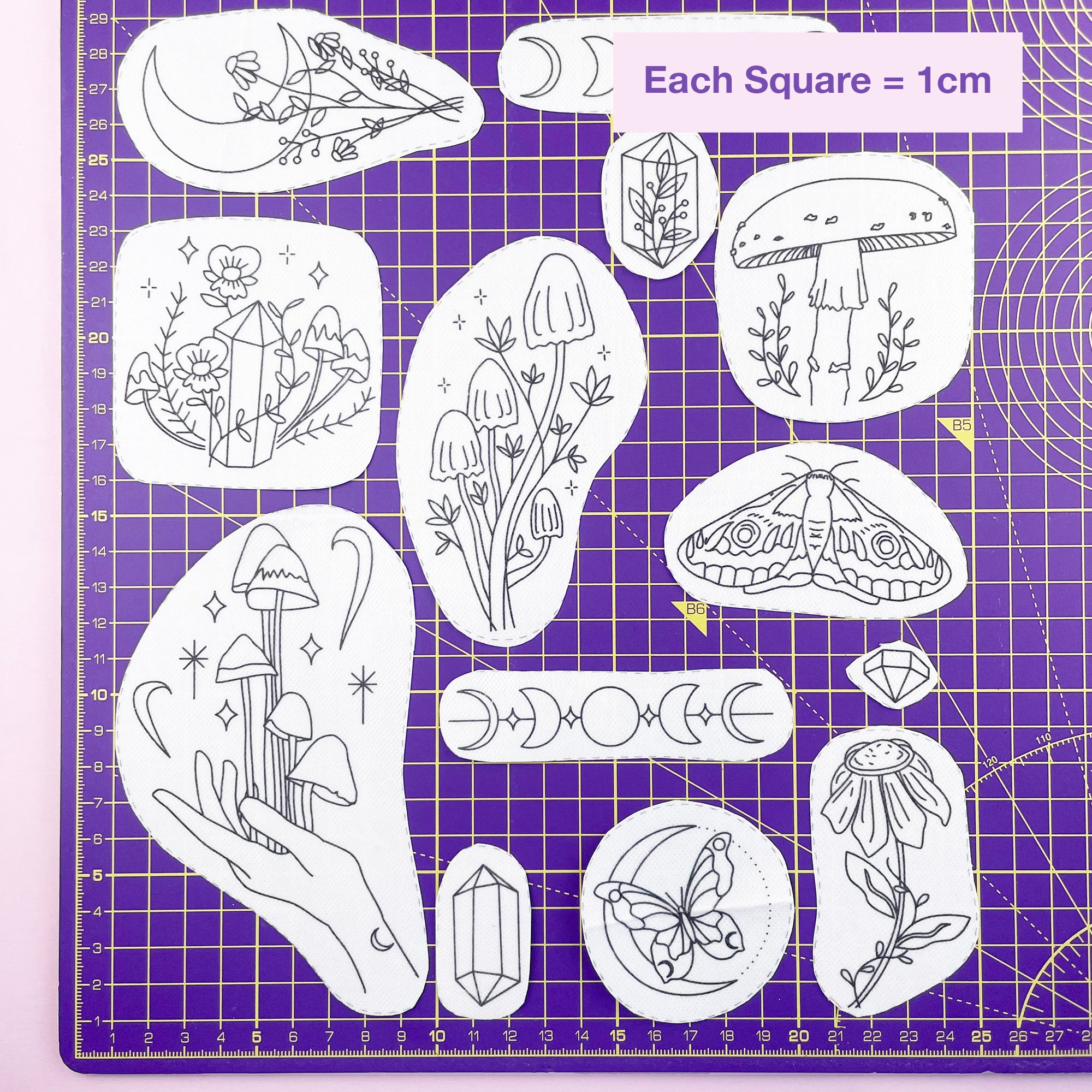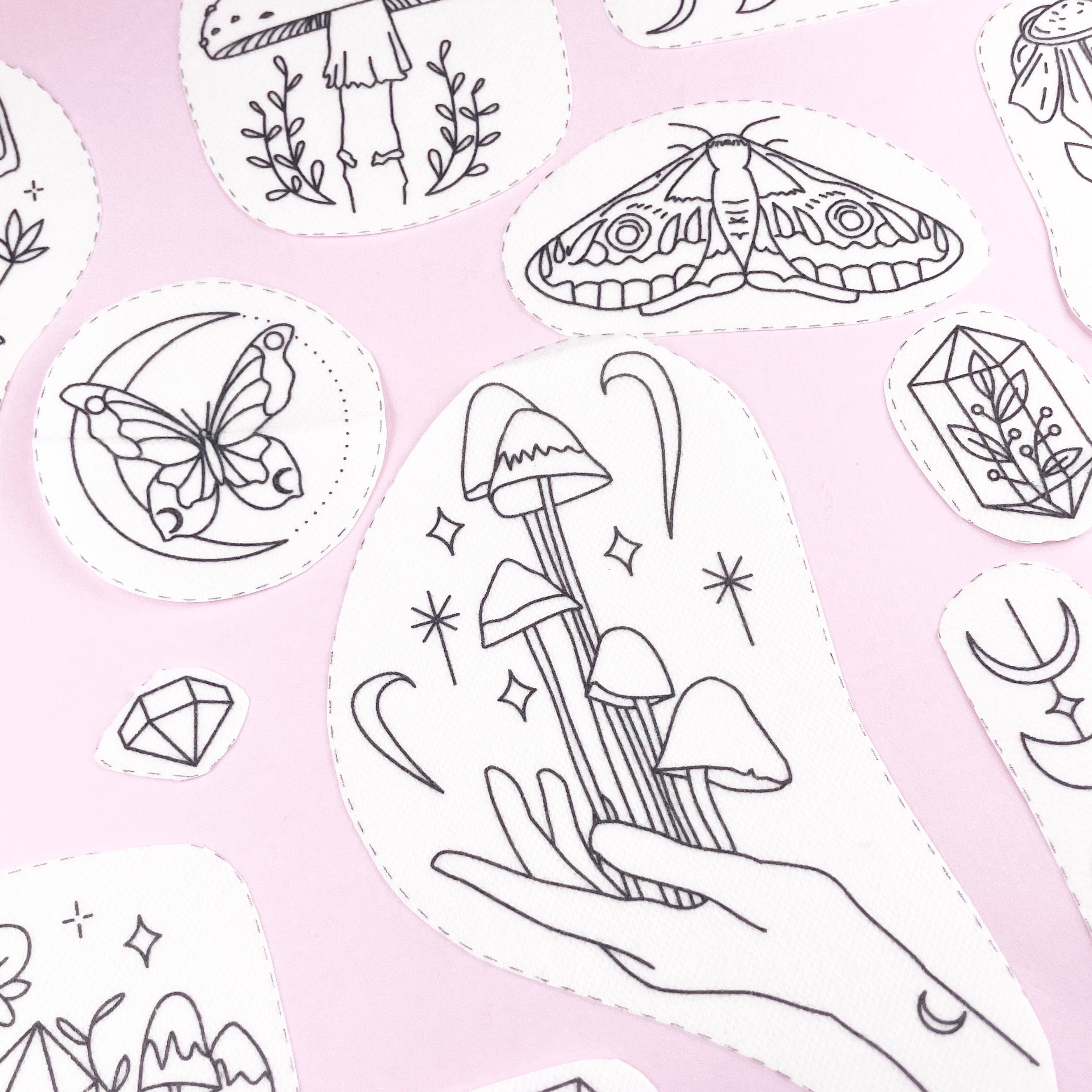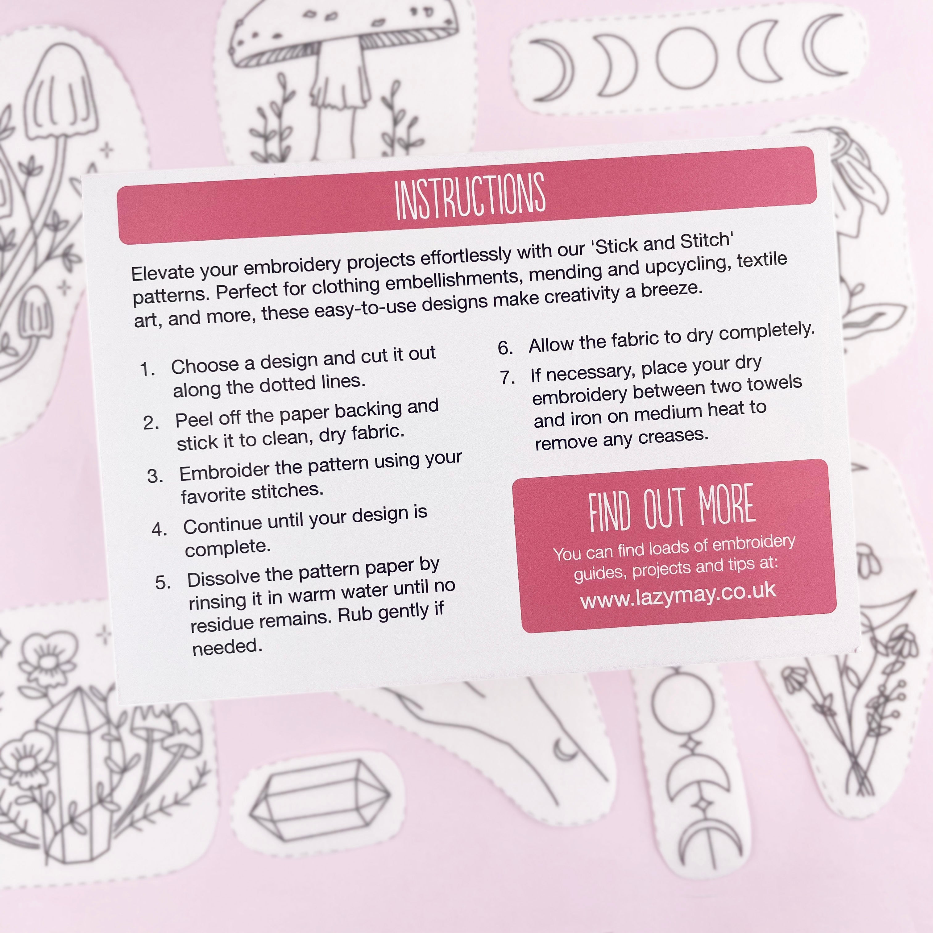 Add a magical touch to your next embroidery project with this collection of mystic-themed stick and stitch patterns. Featuring mushrooms, moths, crystals, moons and florals, each design is pre-printed on dissolvable stabiliser - just cut them out, stick them onto fabric, stitch over the top, and rinse away. Perfect for beginners or seasoned stitchers looking to personalise clothes, bags or hoops with a dreamy, celestial feel.