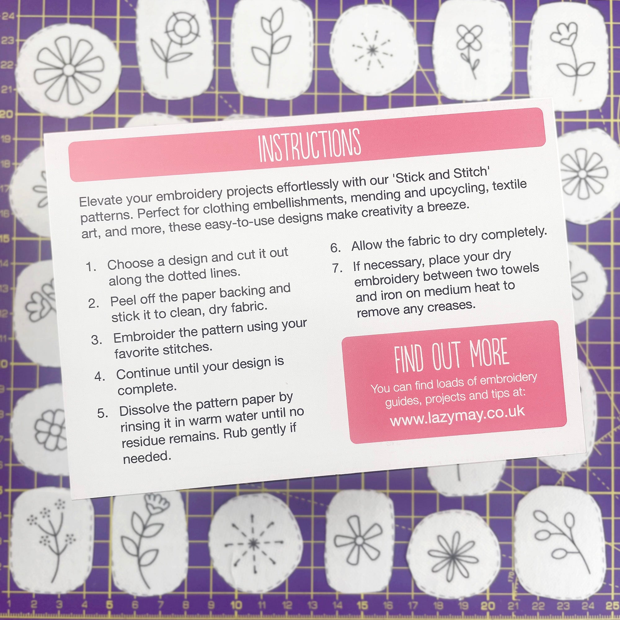 Yes! These patterns are perfect for both beginners and experienced stitchers. Just peel, stick, stitch, and rinse away. Every pack includes full instructions and illustrated guides for key stitches like split stitch, backstitch, stem stitch, and satin stitch.
