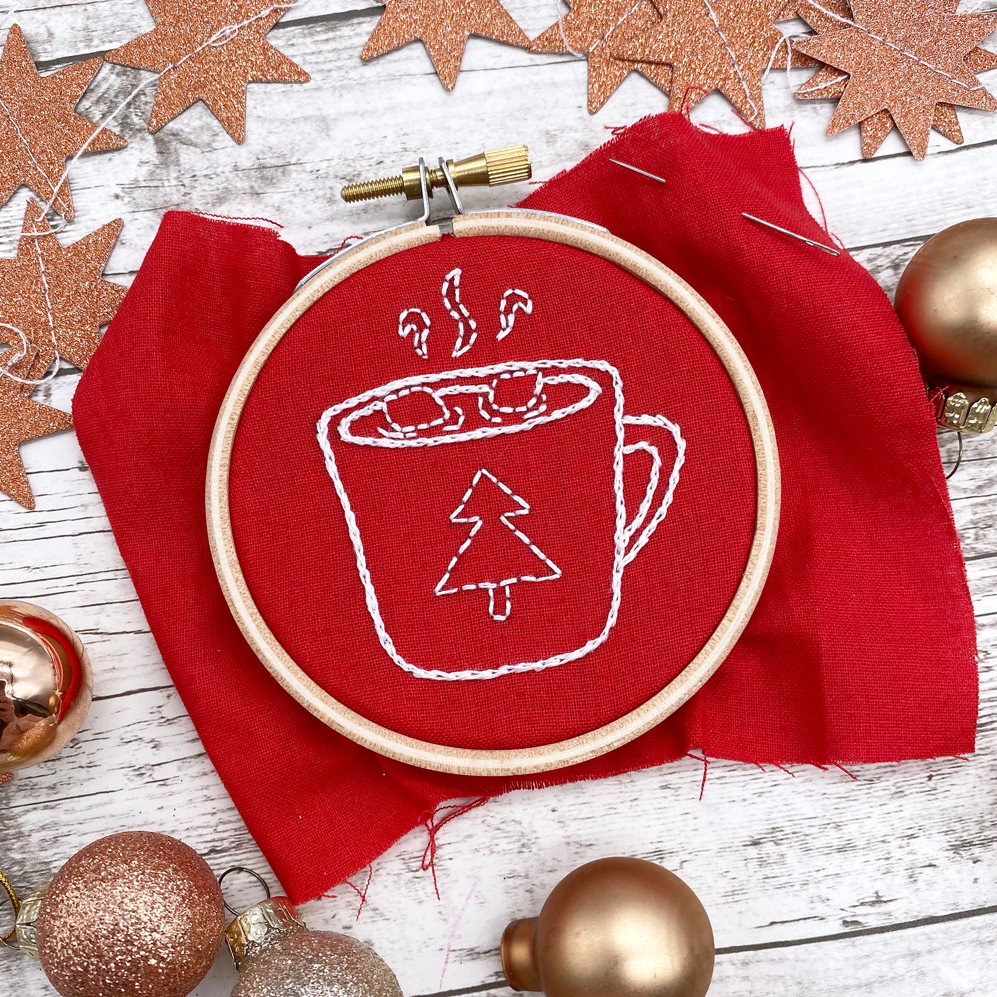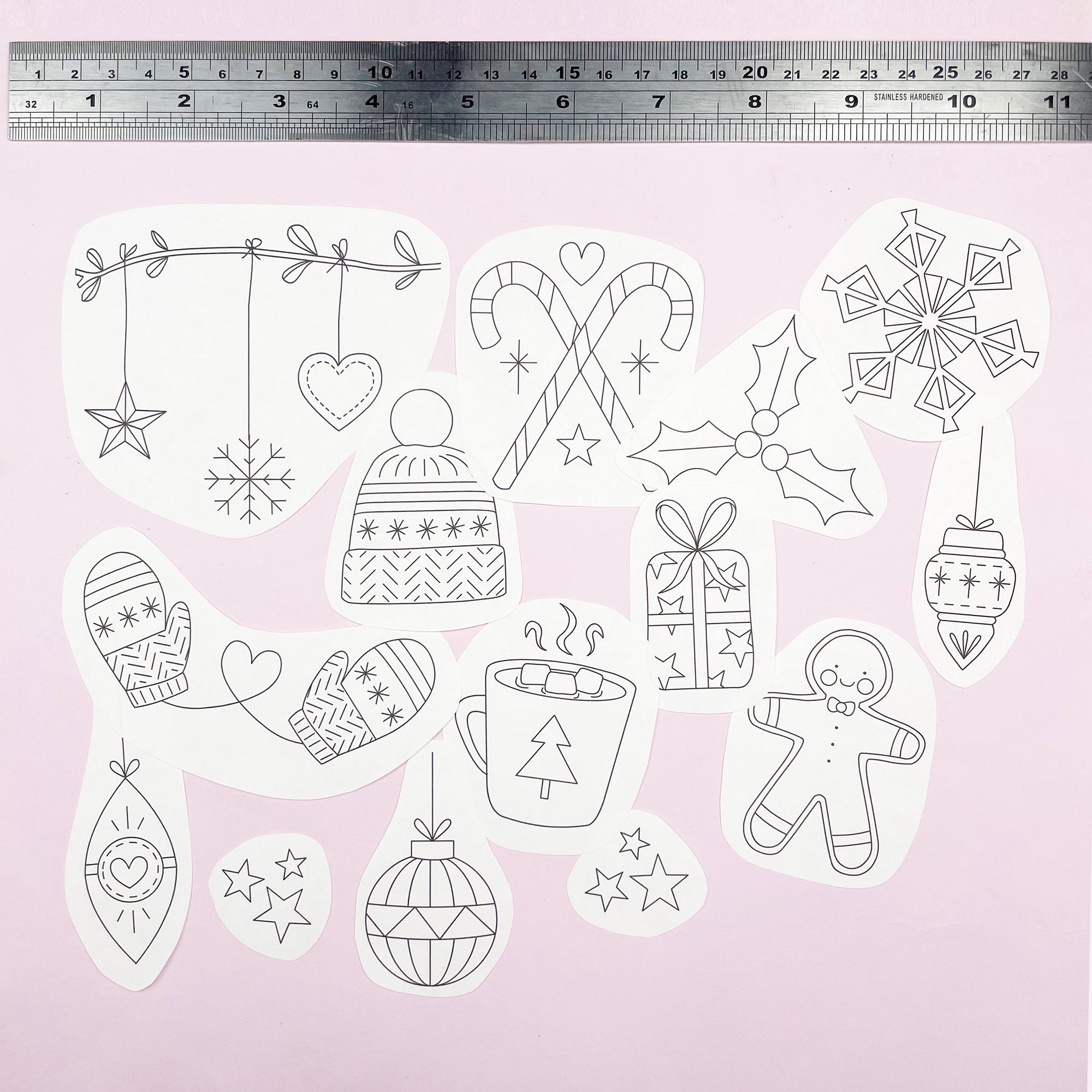 Snuggle down for some winter stitching with this set of Christmas iron on embroidery patterns. Inside you will find baubles, a Christmas tree, hot chocolate and other festive motifs that are simple to transfer and lovely to sew. These designs are perfect for creating mini hoops for the tree, embellishing a cushion cover or making relaxed hoop art to display around the home.