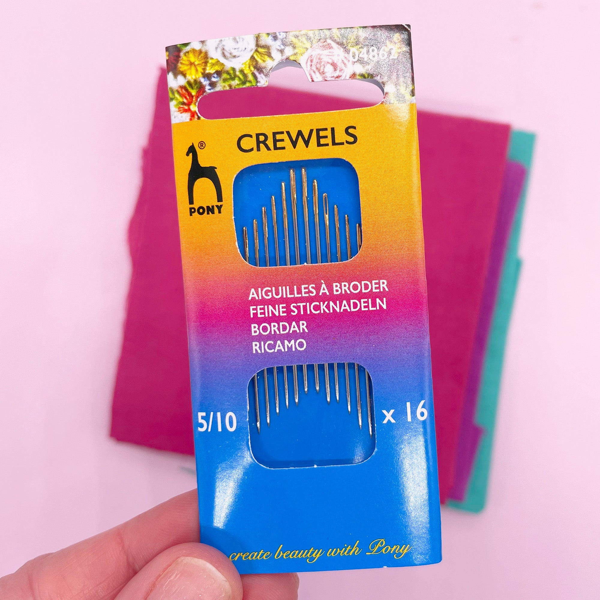 Each pack contains 16 needles in assorted sizes from 5 to 10.