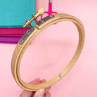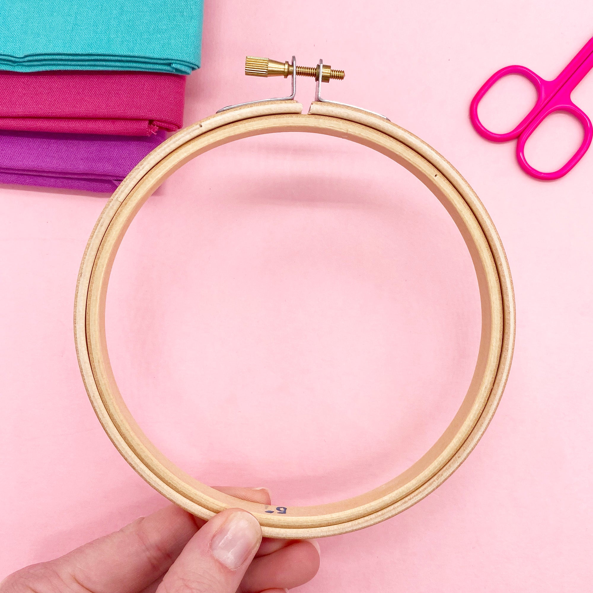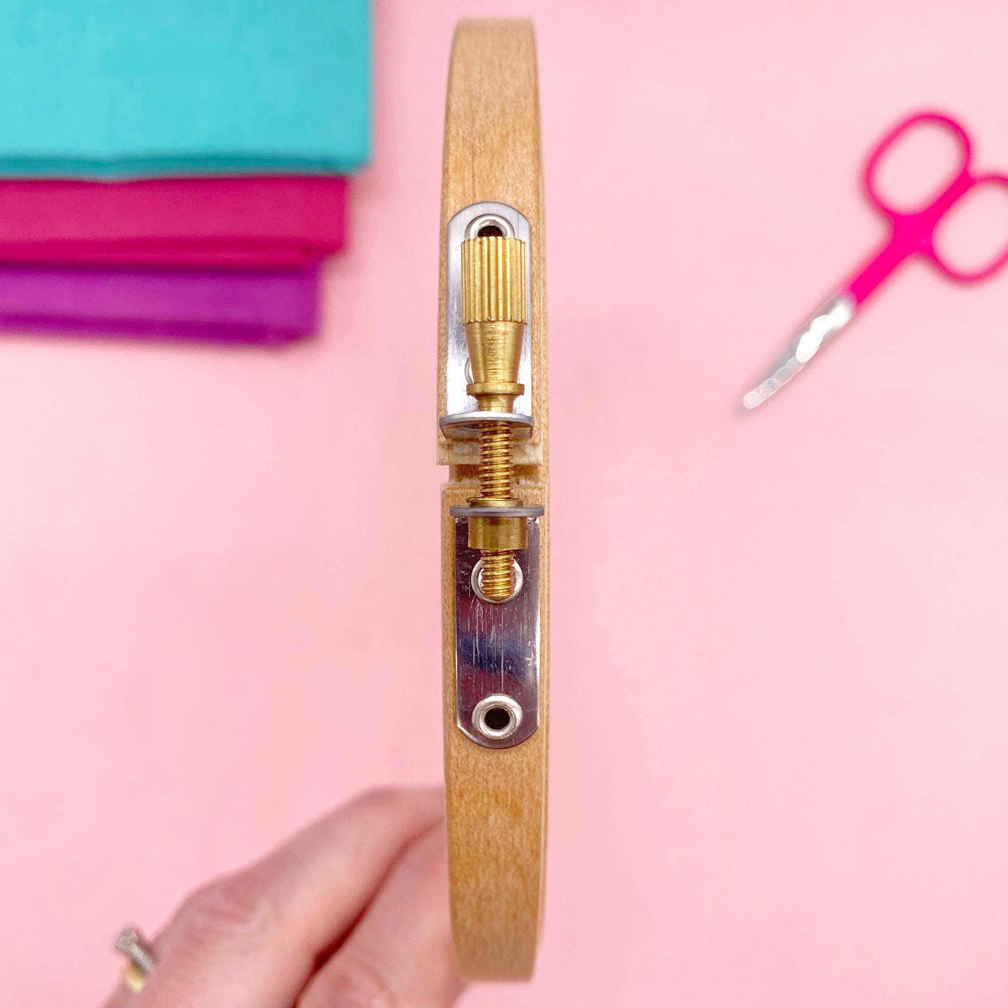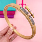 5 inch / 12.7cm diameter wooden embroidery hoop with brass screw fixing.