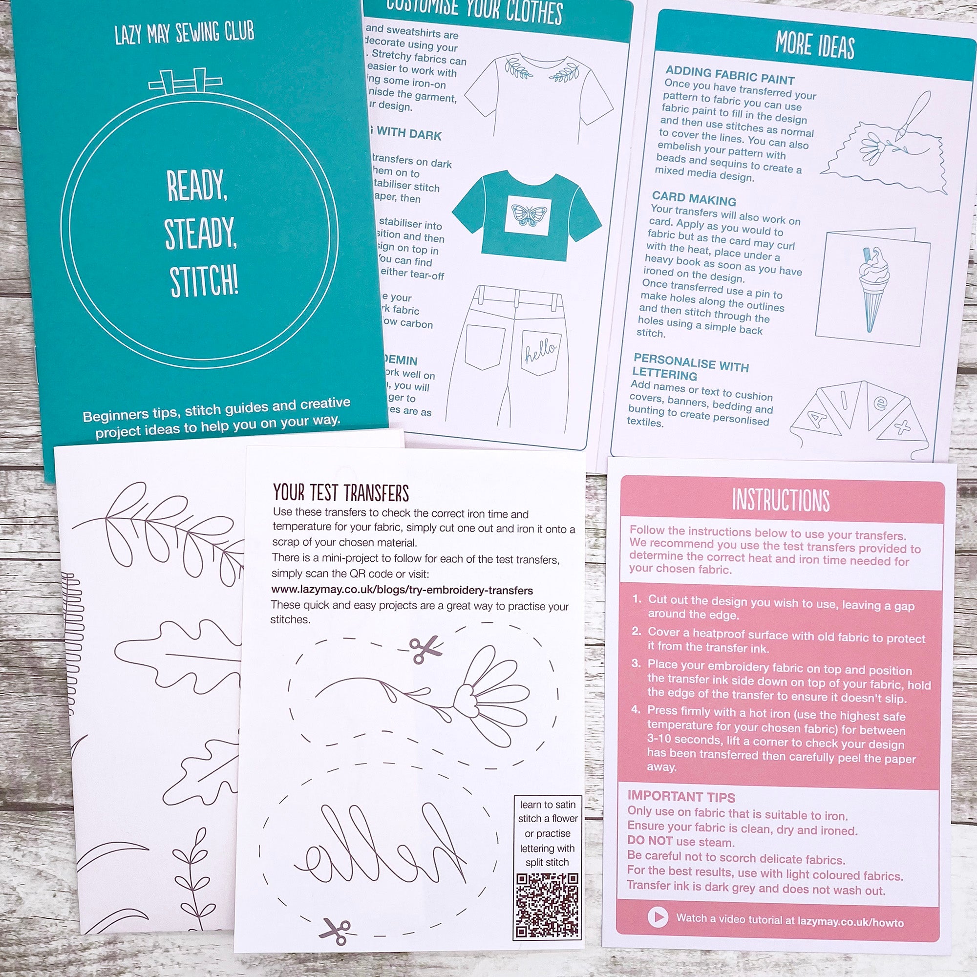 Every transfer pack comes will full instructions, and includes illustrated guides to four of the most popular embroidery stitches, split stitch, back satin, stem stitch and satin stitch.