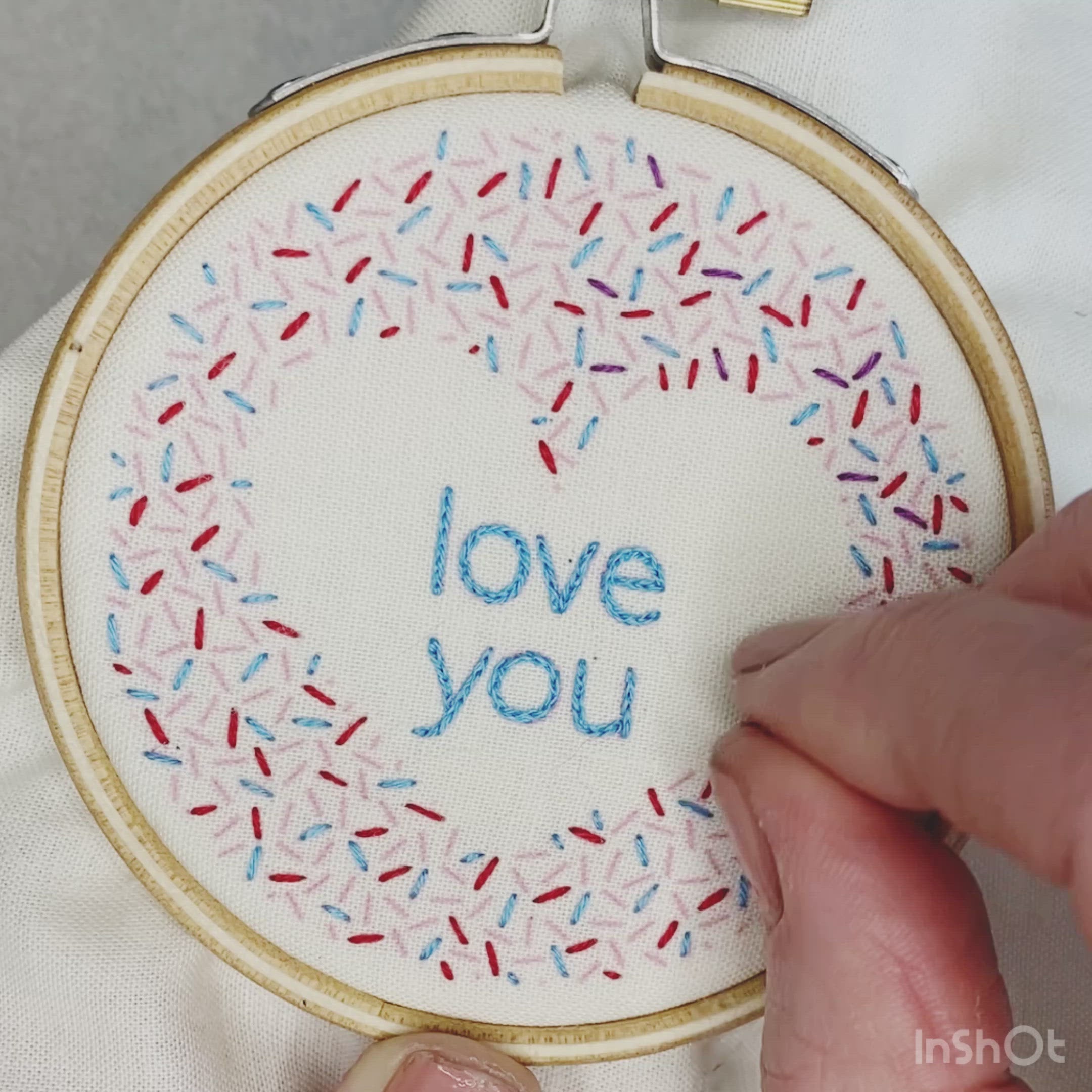 The kit contains enough of each thread for you to choose the colour of the text in centre of the heart.