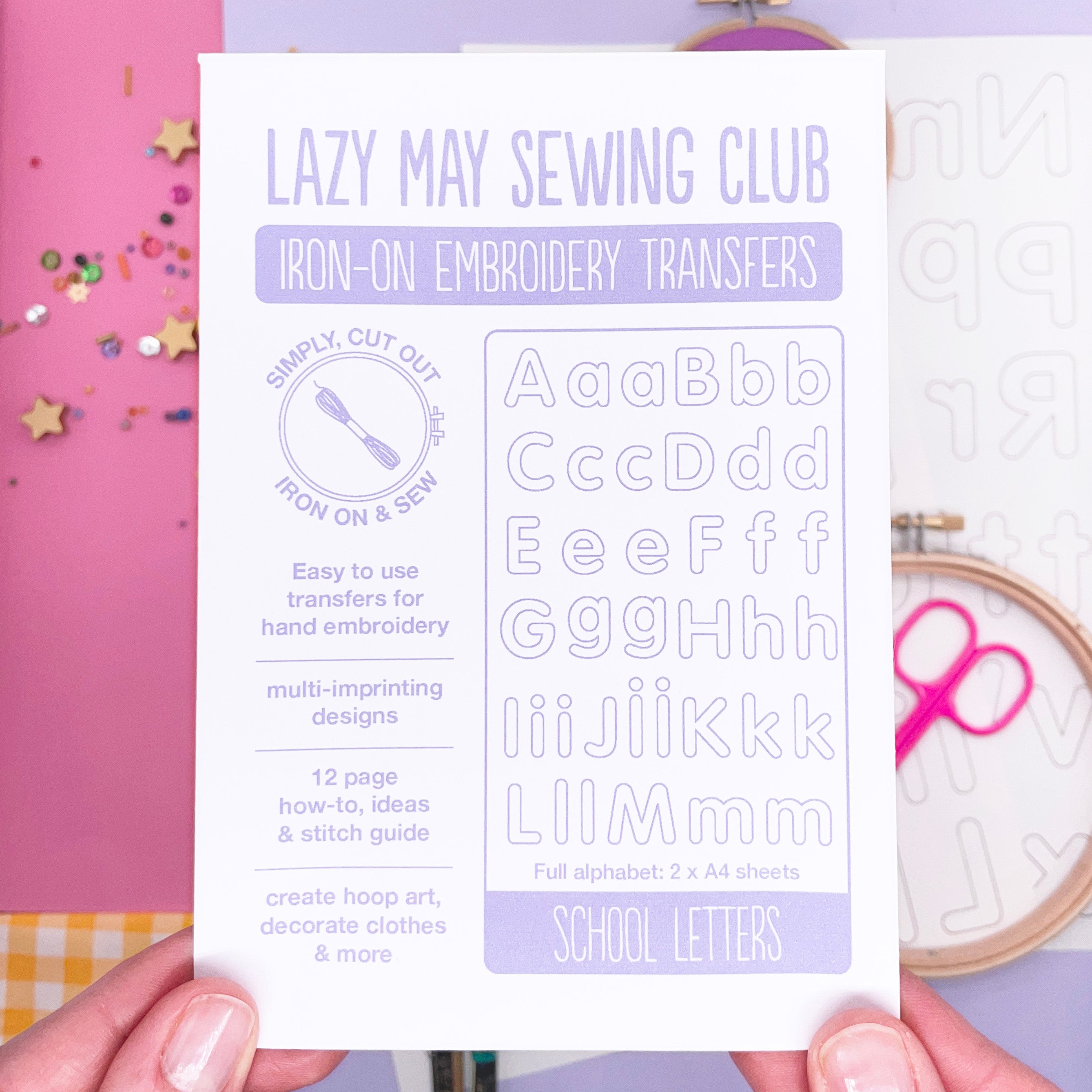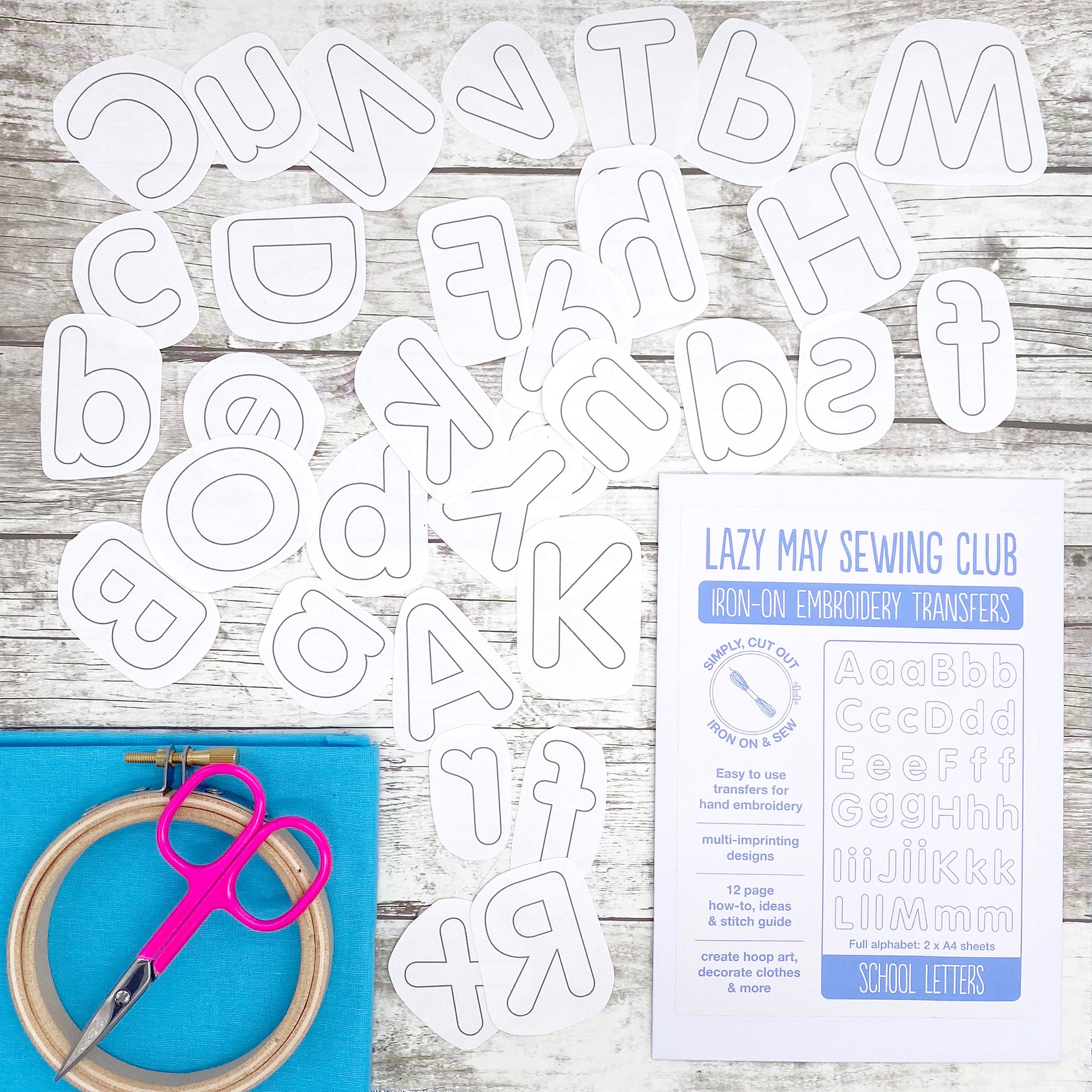 - 2 A4 (21cm x 29cm or 8" x 11.5") sheet iron-on alphabet embroidery patterns featuring all 26 letters in lower case and capital designs.