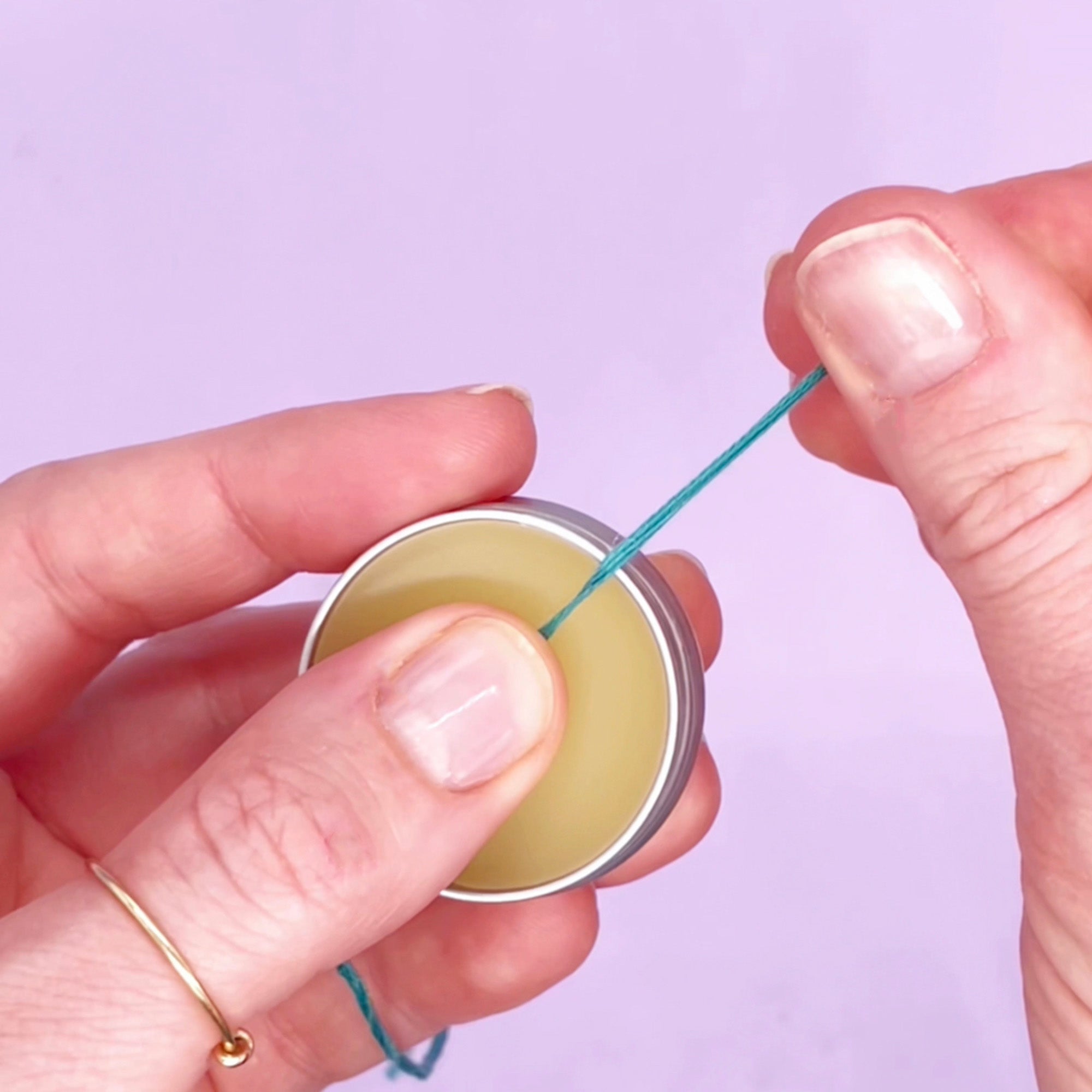 Run the thread through your fingers a couple of time to smooth out the wax and remove any excess.